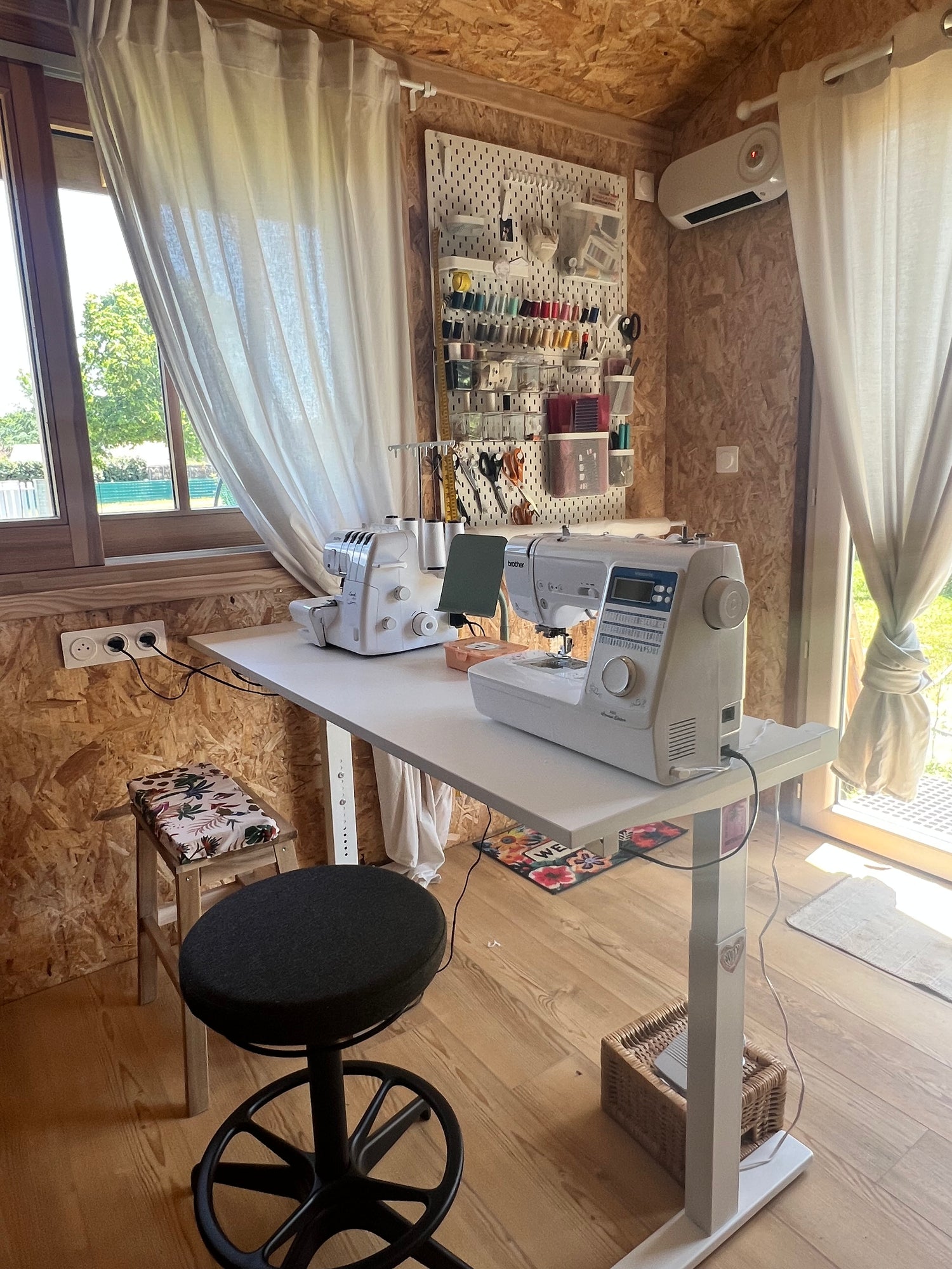 Dans son atelier à la maison, elle imagine et coud chaque pièce, une à une, avec le même plaisir qu’au premier jour.